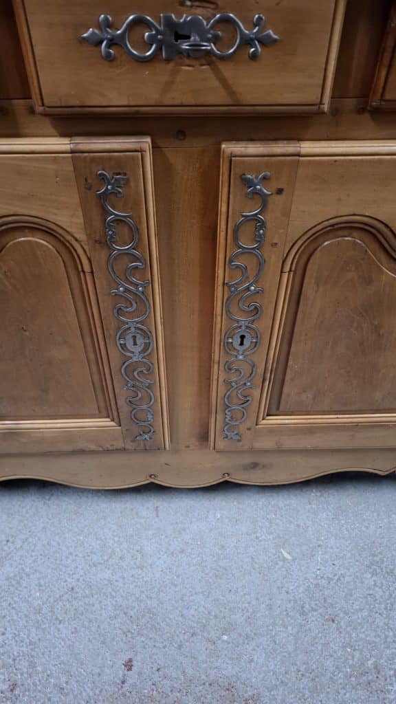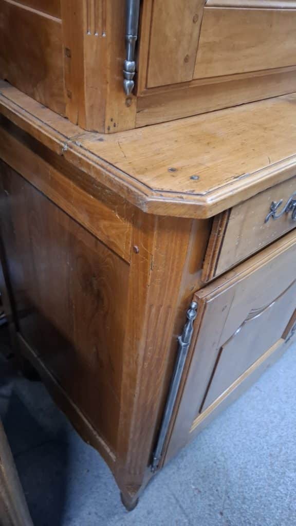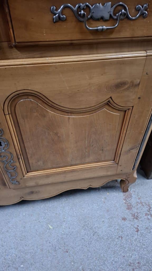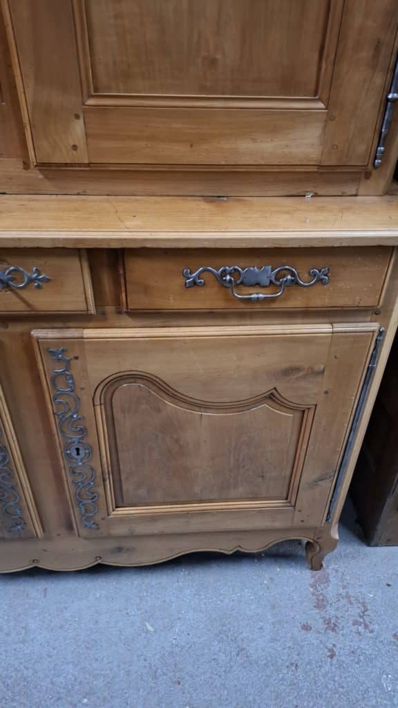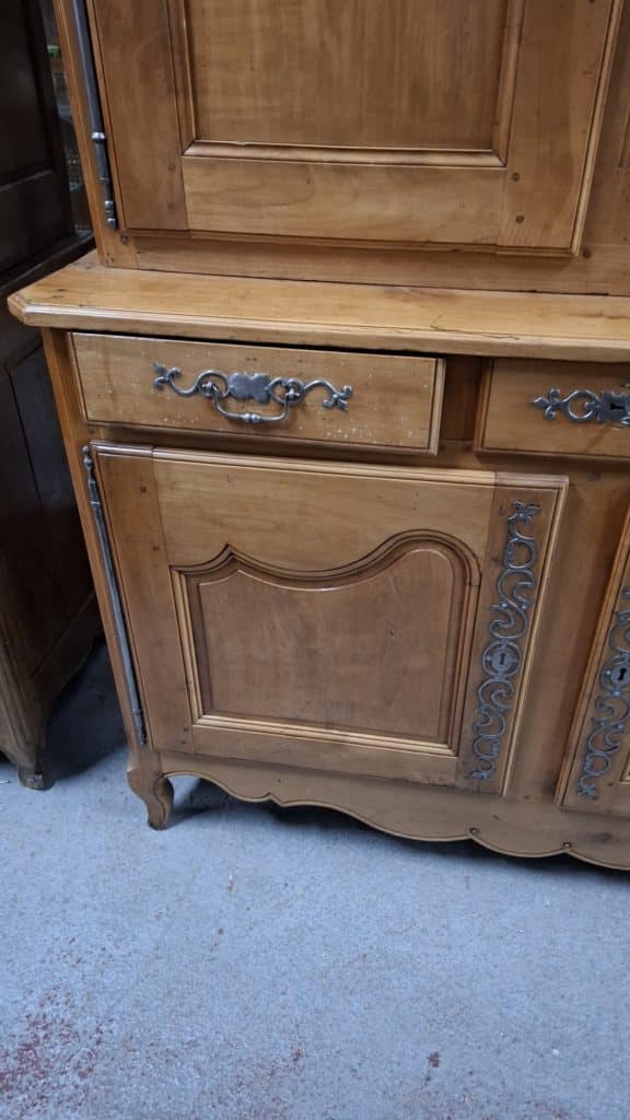 Très beau buffet deux corps en merisier epoque XIX de style Louis xv en parfait état. Ce buffet dispose de trois tiroirs . Deux étagères en haut et une en bas . Buffets en deux parties. Possibilité de livraison dans toute la France et à l étranger. Epoque: 19ème siècle Style: Louis XV – Transition Etat: Très bon état Matière: Bois massif Largeur: 1m41 Hauteur: 2m35 Profondeur: 63 cm