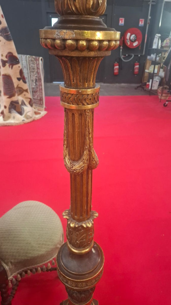 Colonne je pense XIX en bois avec dorure . Le plateau du haut n est pas d origine.  Etat correct . Dorure à la feuille d or. Possibilité de livraison dans toute la France et à l étranger .Epoque: 19ème siècle Style: Louis XVI – Directoire Etat: Bon état Matière: Bois peint Largeur: 36 cm Hauteur: 1m62